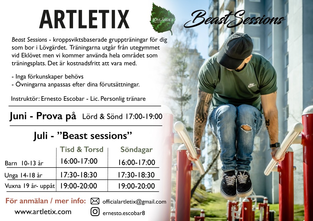 BEAST Sessions- Kroppsviktsbaserade gruppträningar! Med fokus på övningar som kan användas vart som helst, när som helst, i hemmet, utomhus, på utegymmet m.m. Vi kommer använda hela området som träningsplats. Vi kommer definitivt vara en del i naturen